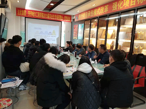 畢業(yè)生們首先觀(guān)看了集團公司和工程公司宣傳片,工程公司經(jīng)理陳貴榮就公司的發(fā)展概況、企業(yè)文化、本次招聘的工作崗位以及薪酬、福利等內容作了介紹。隨后,畢業(yè)生們進(jìn)行了自我簡(jiǎn)介,現場(chǎng)咨詢(xún)了有關(guān)工作的情況,陳經(jīng)理一一進(jìn)行了詳細解答,幫助他們更好的了解達欣集團。聽(tīng)取了介紹后,畢業(yè)生們也紛紛表達了想加入到達欣團隊中的意愿。