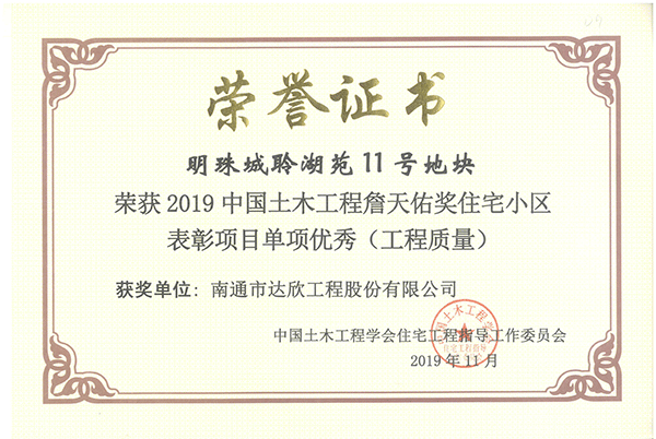 11月7日,2019中國土木工程詹天佑獎優(yōu)秀住宅小區技術(shù)交流暨第六屆全國新型建筑工業(yè)化創(chuàng )新技術(shù)交流會(huì )在蘇州召開(kāi),達欣集團第一工程公司承建的蘇州吳江新湖明珠城聆湖苑11號地塊住宅項目榮獲2019中國土木工程詹天佑獎住宅小區表彰項目。