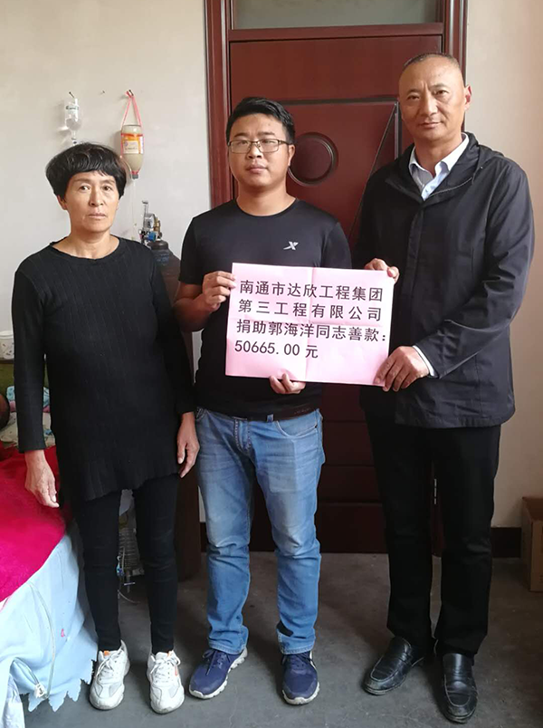第三工程公司黨支部書(shū)記陳仁富經(jīng)常:“愛(ài)心無(wú)小事,樂(lè )善好施,扶貧幫困”是達欣人的傳統美德。在知曉情況后,立即發(fā)出愛(ài)心倡議。黨員們積極帶頭,全體員工紛紛伸出充滿(mǎn)愛(ài)心之手,將50665元善款在第一時(shí)間送到郭海洋及家人手里。