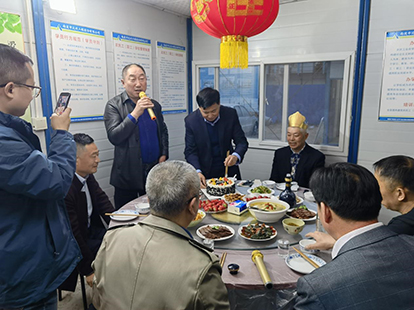 4月10日下午,集團公司安全總監、工會(huì )主席溫鶴華來(lái)到唐山邊各寨棚改項目巡查工作,恰逢老員工沈永鶴60歲生日,集團監事會(huì )主席徐仁忠、第六工程公司各科室負責人以及邊各寨項目全體管理人員在工地食堂共同為壽星老沈慶祝了一場(chǎng)特別的生日。