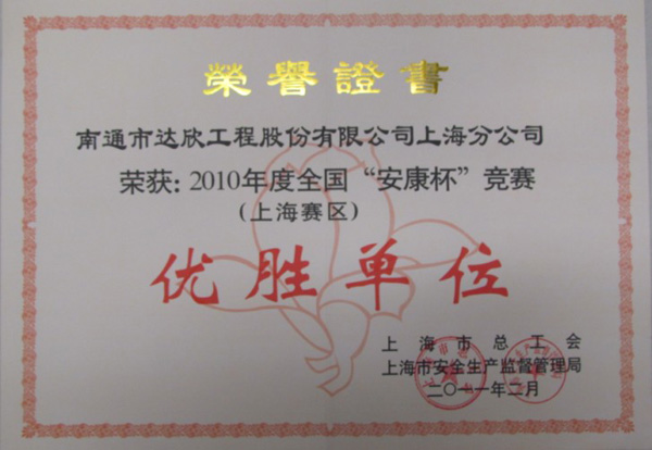 會(huì )上還對“安康杯”競賽活動(dòng)的先進(jìn)集體與個(gè)人進(jìn)行了表彰。第一工程公司“安康杯”競賽活動(dòng)工作的有效開(kāi)展,得到了上海市總工會(huì )、上海市安全生產(chǎn)監督管理局、上海市建交委、江蘇省駐滬辦的充分肯定,為此被評為2010年全國“安康杯”競賽(上海賽區)優(yōu)勝單位(受此表彰的外省市進(jìn)滬施工企業(yè)僅此三家),這也是第一工程公司連續三年獲此榮譽(yù)。