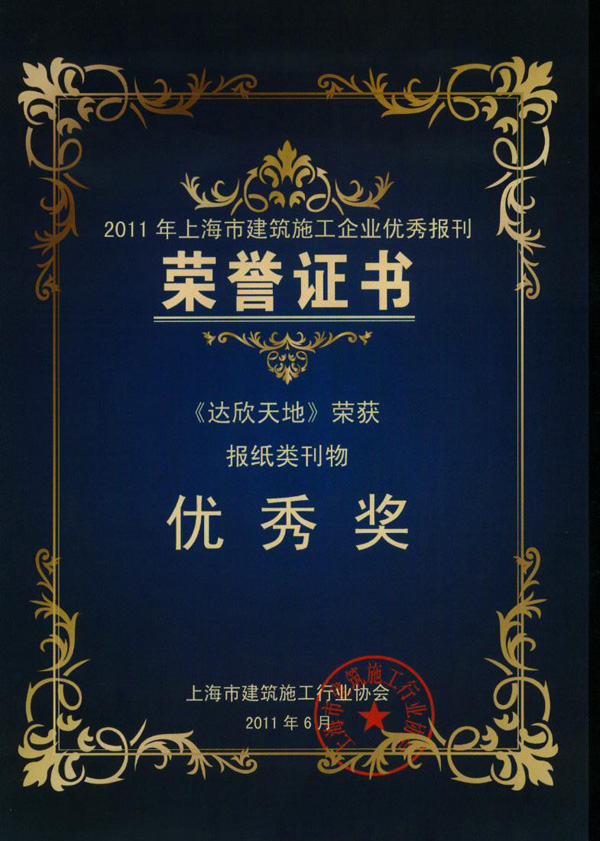 2011年上海市建筑施工企業(yè)優(yōu)秀報刊及協(xié)會(huì )優(yōu)秀通訊員表彰會(huì )日前召開(kāi),由上海市建筑施工企業(yè)優(yōu)秀報刊評委會(huì )評選,公司創(chuàng )辦的“達欣天地”報榮獲2011年上海市建筑施工企業(yè)優(yōu)秀報刊獎。