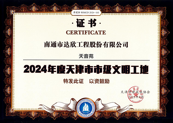 近日,天津市建筑業(yè)協(xié)會(huì )發(fā)布了津建協(xié)〔2025〕9號關(guān)于公布2024年度天津市文明施工示范工地和天津市市級文明工地通過(guò)工程的名單,第六工程公司承建的天音苑項目被授予“2024年度天津市市級文明工地”稱(chēng)號。