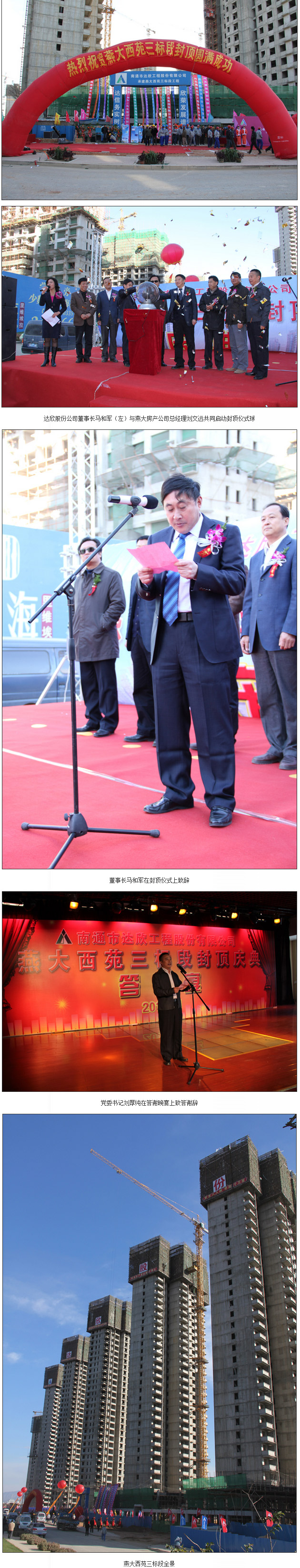 出席這次燕大西苑三標段工程封頂儀式的有秦皇島市建設局副局長(cháng)徐亞龍、燕山大學(xué)校長(cháng)助理兼燕大房地產(chǎn)開(kāi)發(fā)有限公司總經(jīng)理劉文遠和我公司的兩會(huì )(董事會(huì )、監事會(huì ))成員、董事會(huì )顧問(wèn)以及其他協(xié)作單位的相關(guān)領(lǐng)導。慶典儀式上,秦皇島建設局副局長(cháng)徐亞龍和我公司董事長(cháng)馬和軍、黨委書(shū)記劉厚純等均對燕大西苑三標段項目的建設及圓滿(mǎn)封頂表示了高度的肯定。