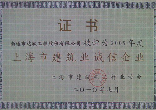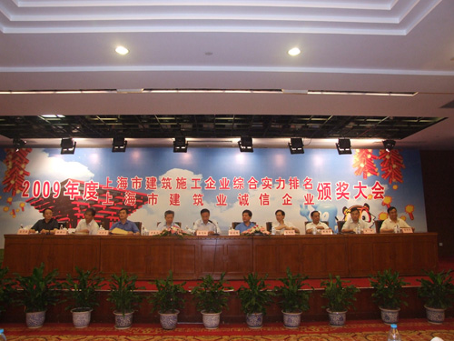 2010年7月30日,2009年度上海市建筑施工企業(yè)綜合實(shí)力及上海市建筑業(yè)誠信企業(yè)頒獎大會(huì )在青松城會(huì )議中心召開(kāi)。出席會(huì )議的有上海市建委、上海市建管辦、市場(chǎng)管理總站、施工行業(yè)協(xié)會(huì )、各省滬辦領(lǐng)導以及獲獎企業(yè)共四百多人參加。