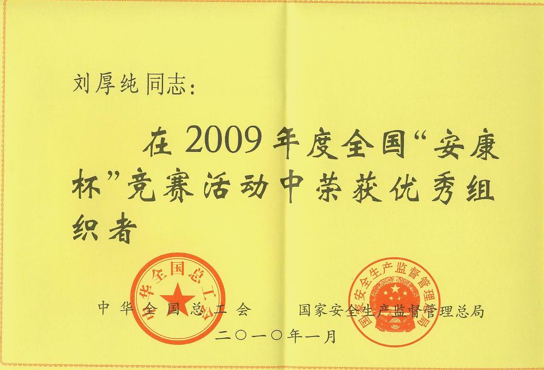 中華全國總工會(huì )、國家安全生產(chǎn)監督管理總局聯(lián)合發(fā)文,公司黨委書(shū)記、副董事長(cháng)劉厚純獲得2009年度全國“安康杯”競賽活動(dòng)優(yōu)秀組織者稱(chēng)號。