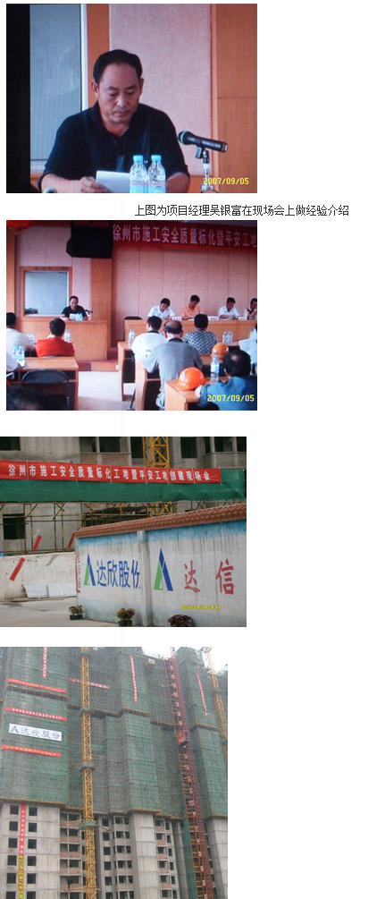 大會(huì )上吳經(jīng)理的發(fā)言得到了大家一次又一次的掌聲,建設局安監處王處長(cháng)最后對這次的現場(chǎng)會(huì )作了很高的評價(jià)。通過(guò)這一次的活動(dòng),極大的提高了“達欣股份”在徐州建筑市場(chǎng)的知名度,為“達欣股份”進(jìn)軍強手之林奠定了基石,提升了我們的品牌形象。