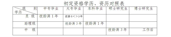1、初定條件:大中專(zhuān)畢業(yè)生在所學(xué)專(zhuān)業(yè)與所從事工作的專(zhuān)業(yè)相同或相近的前提下,具備以下國家規定的相應學(xué)歷、從事專(zhuān)業(yè)技術(shù)工作年限(表中簡(jiǎn)稱(chēng)“技齡”)的,可申請初定相應級別的專(zhuān)業(yè)技術(shù)資格: